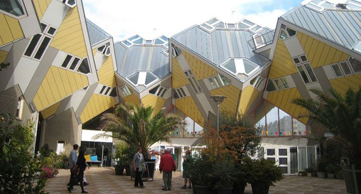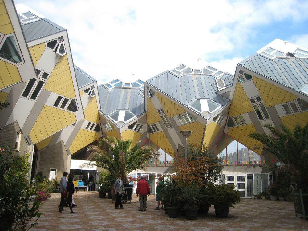 Modern mimarinin en önemli eserlerinden olan Cubic Houses, Hollandalı mimar Piet Blom tarafından 1982 yılında tasarlanmış, 1984 yılında ise hayata geçirilmiş. Perspektif, zeka ve sınırsız hayal gücünün birleşimi olan bu evler bir yaya köprüsünün üzerine konumlandırılmış. Başlangıçta 50 adet olması planlanan fazlasıyla köşeli bu evler şu ana kadar 38’i küçük 2’si süper olmak üzere 40 tane evden oluşuyor.