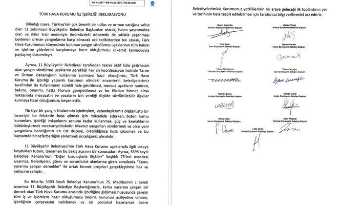 “Bilindiği üzere, Türkiye’nin çok önemli bir nüfus ve orman varlığına sahip olan 11 şehrimizin Büyükşehir Belediye Başkanları olarak, halen yaşanmakta olan ve iklim krizi nedeniyle önümüzdeki dönemde de sıklıkla yaşanması beklenen orman yangınlarına karşı alınacak acil tedbirlerden biri olarak, Türk Hava Kurumunun bünyesinde bulunan yangın söndürme uçaklarının tüm bakım ve işletme giderlerini karşılamaya hazır olduğumuzu Ek’te yer alan deklarasyonla kamuoyuyla paylaşmış durumdayız.