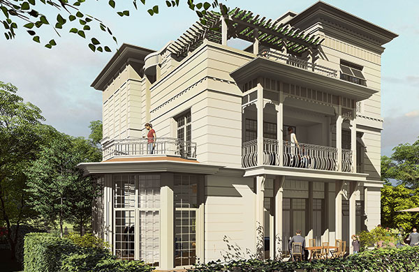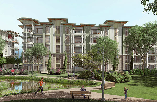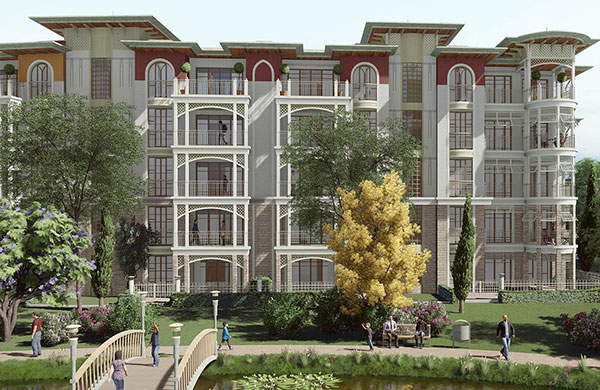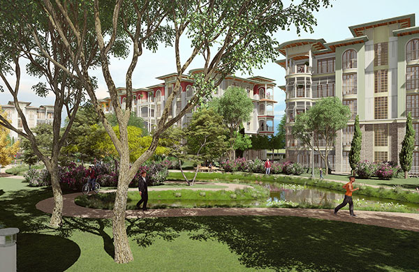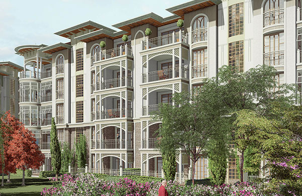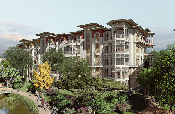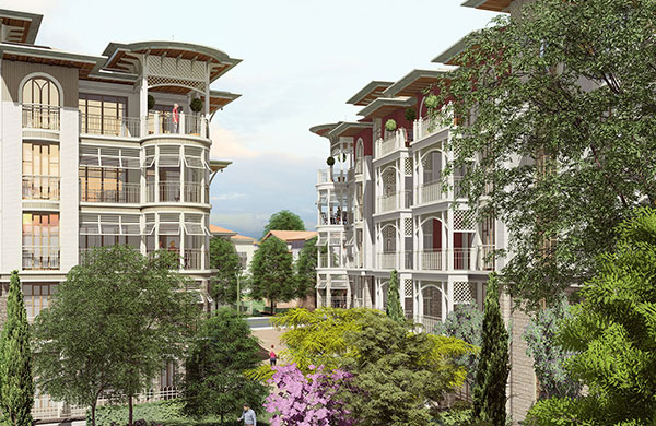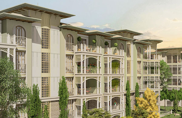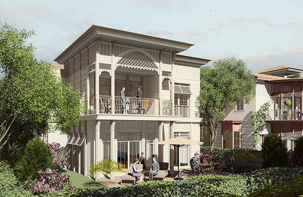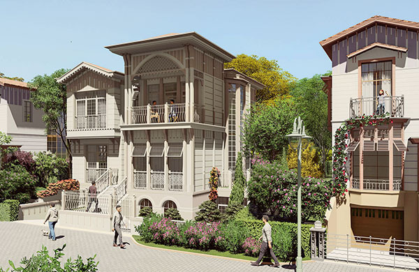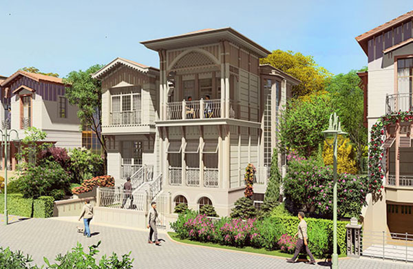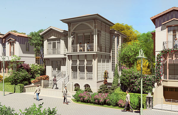60 villa, 182 daire ve 12 ticari üniteden oluşan projede yatay mimari ve konak/saray üslubu tercih edildi.