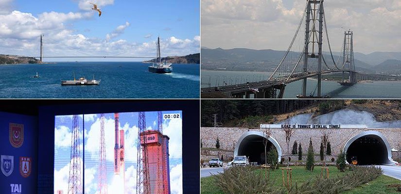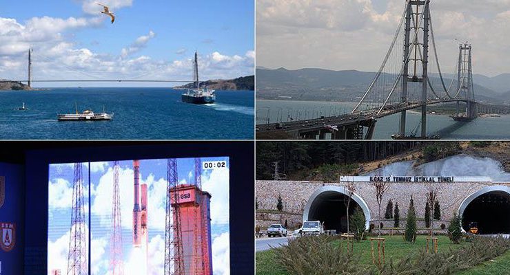Türkiye, 2016 yılı içinde pek çok dev projeyi hizmete soktu. Dünyanın en geniş asma köprüsü niteliğindeki olan Yavuz Sultan Selim Köprüsü, Asya ve Avrupa yakasını deniz altından karayoluyla birleştiren Avrasya Tüneli ve Gebze-İzmir Otoyolu Projesi kapsamında inşa edilen Osman Gazi Köprüsü’nun ardından Ilgaz 15 Temmuz İstiklal Tüneli de bugün hizmete açıldı. AA’nın derlediği bilgilere göre, hizmete sunulan ulaşım projelerinin çoğu, kısmı dünyanın en büyükleri arasında yer alıyor.