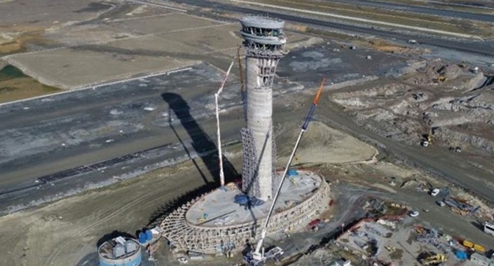 Havalimanı inşaatında önemli bir yeri olan Hava Trafik Kontrol Kulesi 90 metre yüksekliğine ulaşıp lale figürünün ortaya çıkması havadan görüntülendi.