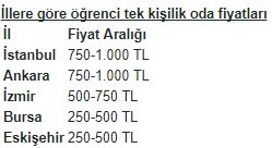 Hürriyet Emlak verilerine göre, Türkiye genelinde yurt yerine kiralık eve yerleşmeyi tercih eden öğrenciler, maksimum 1000 TL’ye kadar kiralık ev arıyor. 2016 yılında yapılan aramalarda ise kiraları maksimum 950 TL olan evlerin daha çok arandığı görülüyor. Devlet yurtları ya da özel yurtlar için elini çabuk tutanlar barınma sorununu hallederken, evde kalmak isteyen ya da kiralık ev tutmak zorunda kalanların ceplerinden sadece ev için 500 TL ile 1.000 TL çıkıyor.