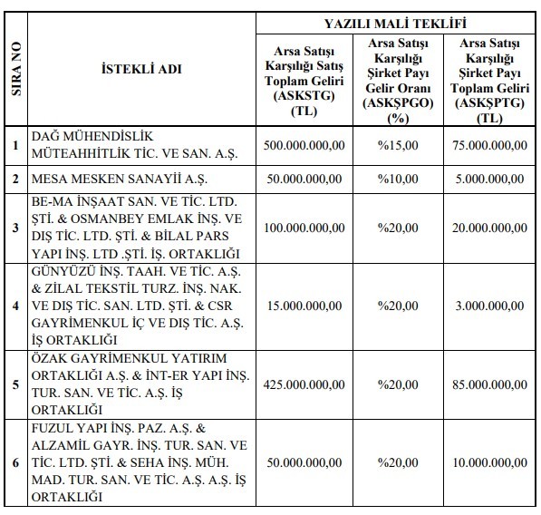425 milyon TL teklif veren firma, arsa satışı karşılığı şirket payı gelir oranı olarak yüzde 20 payı, yani 85 milyon TL ise Emlak Konut’a önerdi.