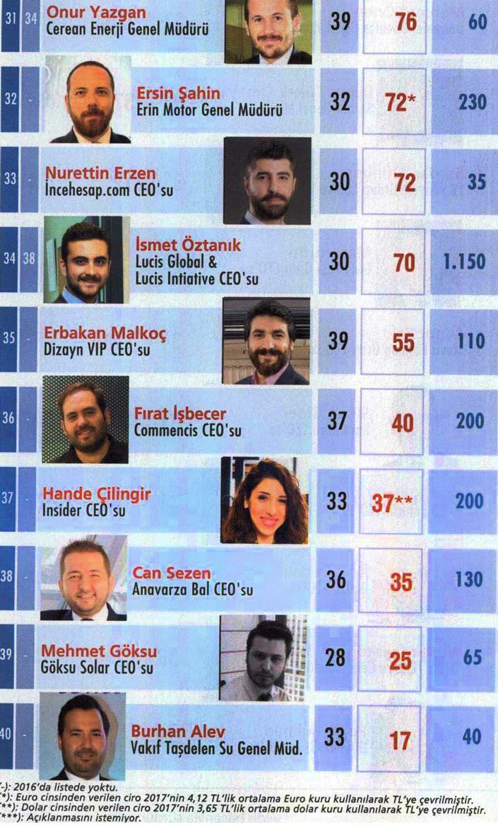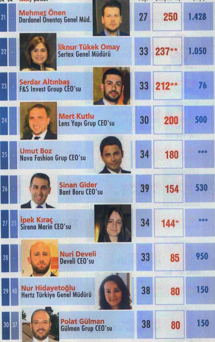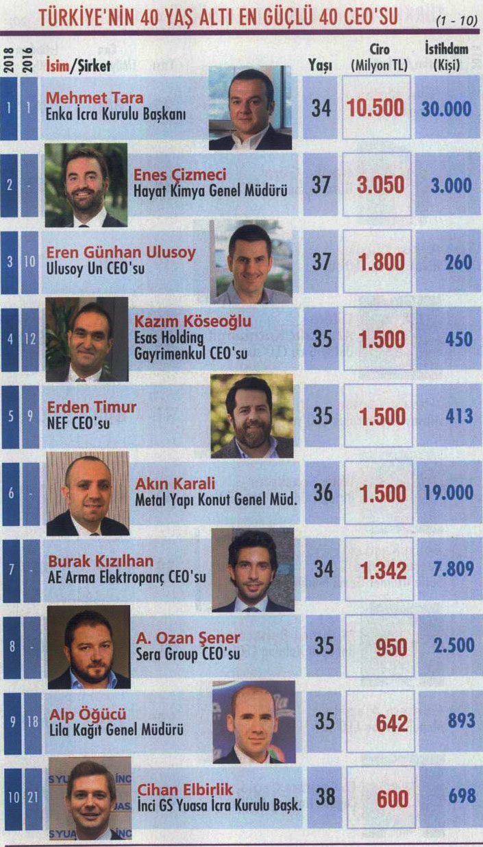40 genç CEO’nun sıralandığı listemizde 19 yönetici 35 yaşın altında. Yaş ortalamasının 34,7 olduğu listedeki 40 isim yaklaşık 30 milyar TL’lik ciroyu yönetiyor.