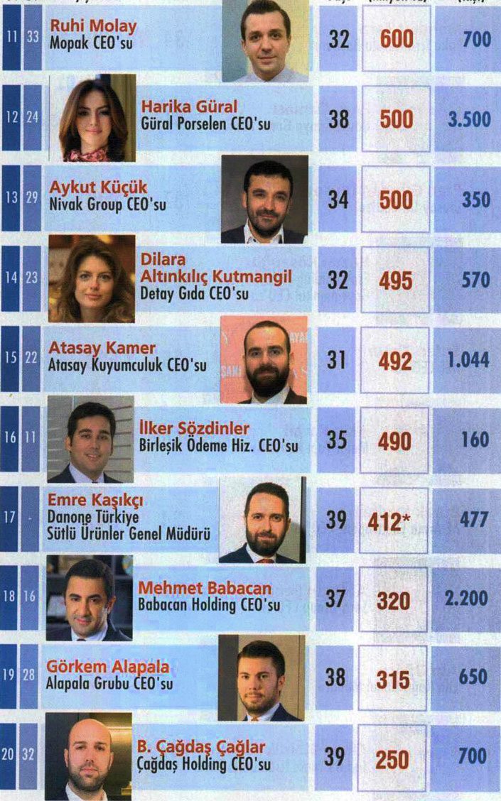 Listemize yeni katılan isimlerden bir diğeri ise Sera Grup CEO’su Ozan Şener. Başarılı bir profesyonel olan TAV CEO’su Sani Şener’in oğlu olan Ozan Şener, gayrimenkul, turizm ve grubun diğer iştiraklerinin yöneticiliğini yapıyor. Babasının rehberliğinde yöneticiliğe adım atan ve 2 bin 500 kişilik bir grubun kaptanlığını yapan Şener, hızlı kararlar almayı sevdiğini söylüyor.