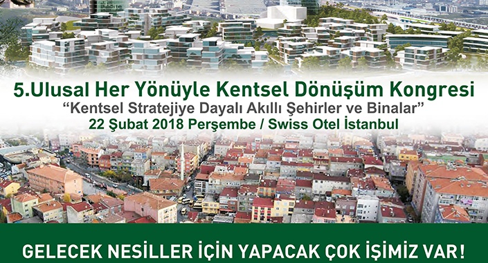 Kentsel dönüşüm sürecini daha iyi bir şekilde anlatmak amacıyla yola çıkan “5. Ulusal Her Yönüyle Kentsel Dönüşüm Kongresi”, ‘Kentsel Strateji Doğrultusunda Akıllı Şehirler ve Binalar’ başlığı altında 22 Şubat 2018 Perşembe günü Swiss Hotel İstanbul’da düzenlenecek.