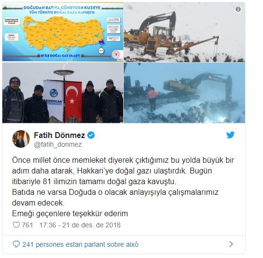 Enerji ve Tabii Kaynaklar Bakanı Fatih Dönmez, Türkiye’de 81 ilin tamamının doğal gaza kavuştuğunu bildirdi.
