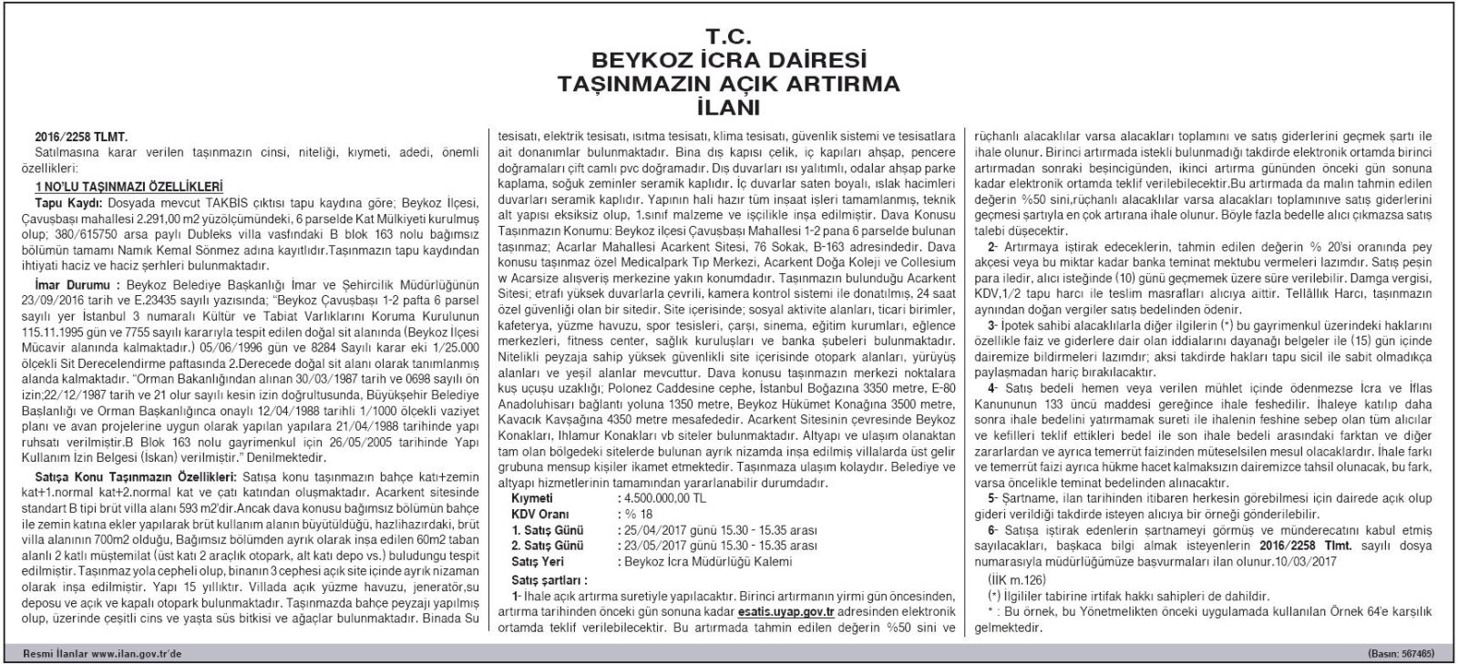 Beykoz İcra Dairesi, Beykoz Çavuşbaşı’ndaki Acarkent Sitesi’nde yer alan metrekarelik villayı icradan satışa çıkardı. Arsa payı 2 bin 291 metrekare olan havuzlu villanın tahmini bedeli 4 milyon 500 bin TL olarak belirlendi.Villanın birinci satışı 25 Nisan 2017 günü saat 15.30-15.35 arasında, ilk satışta satılamaması halinde ikinci satışı ise 23 Mayıs 2017 günü saat 15.30-15.35 arasında Beykoz İcra Müdürlüğü’nde gerçekleştirilecek.