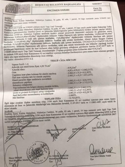 Karara göre, Akmerkez’in Nispetiye Caddesi’ne bakan kısmında bulunan Vakko Pattisserie’de 49.68 metrekare, S Cafe’de 64.40 metrekare, Martinez’de 69 metrekare, Serafina’da 61.10 metrekarelik fazla alan kullanımı olduğu tespit edildi. Yine Akmerkez’in Ahmet Adnan Saygun Caddesi’nde bulunan Starbucks’ta 54.60 metrekare, Papermoon’da ise 120 metrekarelik fazlalık tespit edildi. Lüks AVM’nin bağlı olduğu Akmerkez GYO AŞ’ye 12 bin 725 TL para cezası verilmesi kararlaştırılırken, bir diğer encümen kararı ile de proje dışında kalan alanların yıkımına karar verildi.