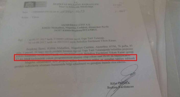 Yıkım kararı, Beşiktaş Belediye Başkan Yardımcısı Rıfat Örnek’in imzası ile şirkete bildirildi. Bildirim yazısında yıkım işleminin 17 Ocak sabah 06.00’da yapılacağı kaydedilerek “Mağdur olmamanız için projeye aykırı kısımların nüfus ve eşyadan tahliye edilerek gerekli tedbirlerin alınması hususunda bilgi edinilmesi ve gereğini önemle rica ederim” denildi.