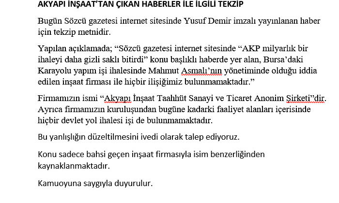 “AKP milyarlık bir ihaleyi daha gizli saklı bitirdi” başlığı ile verilen haberde “Akyapı İnşaat Sanayi ve Ticaret AŞ” isimli bir şirketin Bursa’da yapılacak bir karayolunun ihalesini 815 milyon 729 bin TL’lik bir bedelle kazandığı ve ihalenin kapalı kapılar ardında adrese teslim şeklinde gerçekleştiği bilgisi de yer alıyordu.