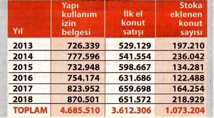 TÜİK verilerine göre yıllar itibarıyla bakılıp, yapı kullanma izin belgesi alan ve satışı yapılan birinci el konut sayısı çıkarıldığında, 2013’te 197 bin, 2014’te 231 bin, 2015’te 132 bin, 2016’da 122 bin, 2017’de 164 bin ve 2018’de 218 bin 929 adet konutun stoka eklendiği görülüyor.
