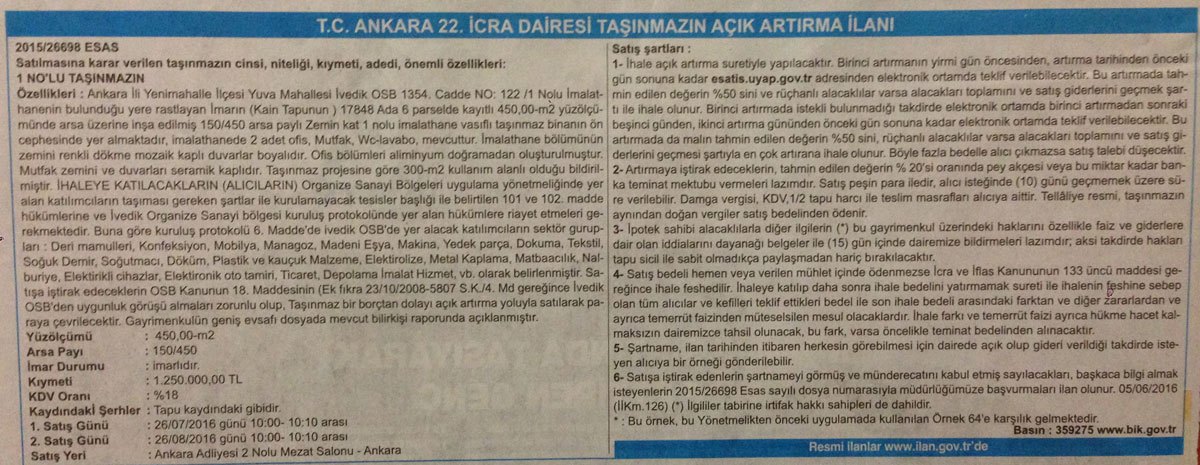 İmarı bulunan işyeri 1 milyon 250 bin liradan satışa çıkarılacak. Açık artırma 26 Temmuz 2016 tarihinde saat 10.00’da Ankara Adliyesi 2 Nolu Mezat Salonu’nda yapılacak. İmalathaneye alıcı çıkmadığı takdirde ikinci satış 26 Ağustos 2016 tarihinde aynı yer ve saatte tekrarlanacak.