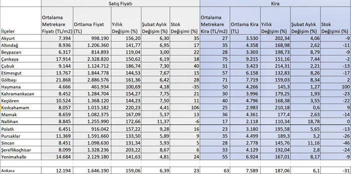 En fazla göç alan illerin başında gelen Ankara’da Şubat ayında kiralık konut stoku %31 düşerken, satılık konut stoku %23 artış gösterdi. Ankara’da Şubat ayında konut kiraları %6,1, satılık konut fiyatları ise %6,39 artış gösterdi. Ankara’da ortalama kira 7 bin 589 TL, konutların ortalama satış fiyatı ise 1 milyon 646 bin 190 TL. Ankara’da konut stokunun en fazla düşüş gösterdiği ilçeler ise Sincan, Pursaklar ve Şereflikoçhisar oldu.