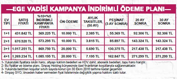 Sinpaş GYO’nun Ankaralıların Ege’de yaşam hayalini gerçeğe dönüştürmek için projelendirdiği Ege Vadisi’nde yüzde 10 + 5 kampanya indirimi var. Bu kampanya ile projedeki 1+1 dairelerin indirimli fiyatları 369 bin 225 TL, 2+1’lerde 670 bin 520 TL, 3+1’lerde 869 bin 750 TL, 4+1’lerde ise 1 milyon 85 bin 195 TL’den başlıyor. 30 Ekim’e kadar geçerli olan kampanyaya göre, 1+1 ve 2+1’ler için 10 bin TL, 3+1 ve 4+1 ‘ler için ise 20 bin TL ön ödeme ile alınabilecek dairelerin peşinatları 3 ay sonda ödenebiliyor. Geri kalan tutar ise 20 ve 30 ay sonra ödemek üzere 2 eşit parçaya bölünüyor.