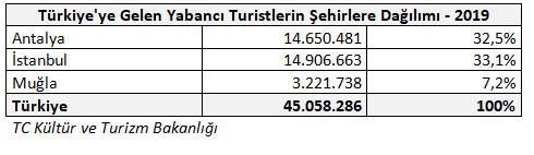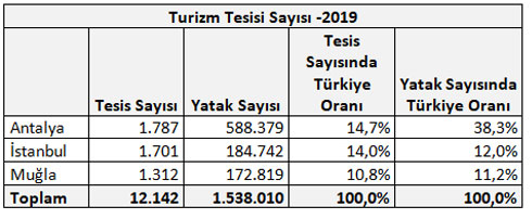 Gayrimenkul sektöründe değerleme, danışmanlık, en iyi kullanım etüdü, proje değerleme, piyasa araştırmaları konularında öncü olan EVA Gayrimenkul Değerleme’ye göre, Türkiye toplamında ise 12.142 adet tesis ve 1.538.010 adet yatak bulunurken, Antalya tesis sayısında Türkiye’de %15’lik, yatak sayısında ise %38’lik yüksek bir orana sahip. Muğla 1.312 adet tesis ile üçüncü sırada bulunurken, 172.819 adet yatak sayısı bulunuyor.