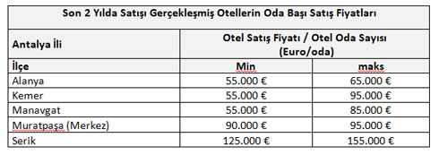 Antalya bölgesinde son 2 yıl içerisinde el değiştiren otel işlemleri incelendiğinde, otel toplam satış fiyatının otelin oda sayısına bölünmesi ile elde edilen odabaşı fiyat aralıklarının maksimum Alanya’da 65 bin Euro, Kemer’de 95 bin Euro, Manavgat’ta 85 bin Euro, Muratpaşa’da 95 bin Euro, Serik’te ise 155 bin Euro olduğunu açıklayan Şahin, sözlerine şöyle devam etti:
