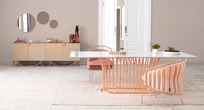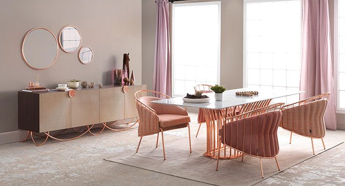 Modern ve retro izler taşıyan sandalyeler, masanın ayağıyla uyumlu bir denge yakalarken, oturma alanlarında kullanılan soft kumaş desenleri, rose metale şık bir gönderme yapıyor. Antares Konsol ise ilhamını aldığı yıldızın simgesini resmeden kulpları ve kapaklarda kullanılan optik geçişler ile iddialı bir kompozisyon yaratıyor.
