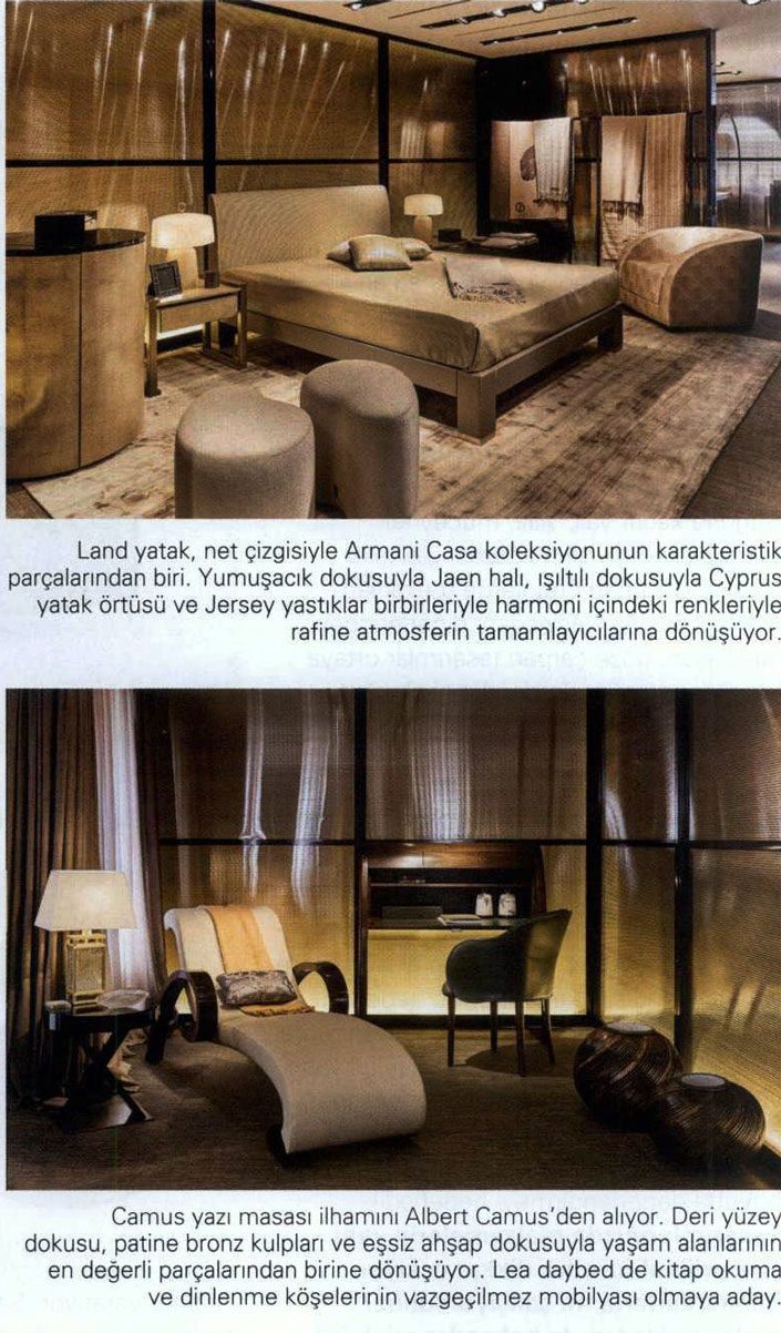 Şıklığı ve sadeliği bir arada barındıran kusursuz çizgilerin dikkat çektiği koleksiyon fark yaratan özel detayları ön plana çıkarıyor ve lüks bir estetik arayan dekorasyon tutkunlarına hitap ediyor. Armani Casa’nın projeleri arasında; İstanbul’da Maçka Residences, Mumbai’de The World Towers, ManilaFilipinler’de Century Spire ve Miami’deki rezidanslar yer alıyor.