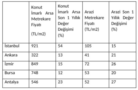 İstanbul’da arsa fiyatları son 1 yılda %54 artış gösterirken ortalama metrekare fiyatı 921 TL oldu. Antalya’da son 1 yıllık değer artışı %23 seviyesinde olurken, ortalama metrekare fiyatı ise 546 TL. Arazi fiyatları son 1 yılda Antalya’da %27, İzmir’de %26 artış gösterdi. Antalya’da arazilerin ortalama metrekare fiyatı 52 TL; İzmir’de ise 72 TL.