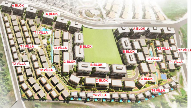 Villa blokları: T1, T2, T3, T4 ve T7 blokları olmak üzere toplam 81 adet müstakil villa bloğu, 195 adet villayı kapsayacak. Villa tipi konutlar, daha geniş yaşam alanları ve müstakil bahçe imkanları arayanlara hitap ediyor.
