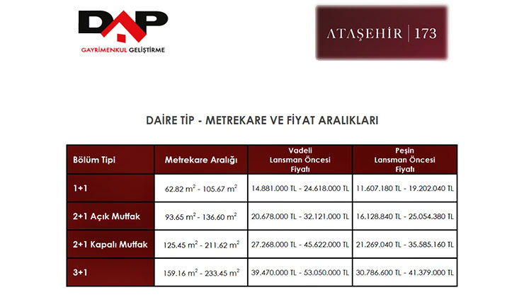 DAP Ataşehir 173’te daire tipleri 1+1, 2+1 (açık ve kapalı mutfak seçenekli) ve 3+1 olarak planlandı.