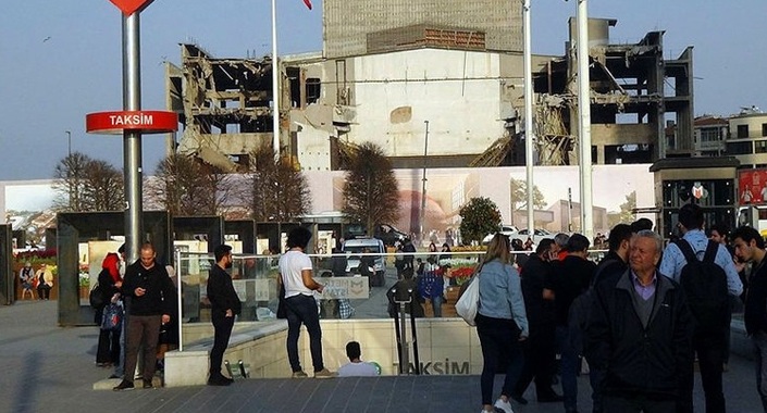 İş makineleri ile yıkımına devam edilen AKM’nin ön cephesinin tamamen yıkılmasının ardından ortaya çıkan beyaz perdeyi gören bazı turistlerin de o anları cep telefonlarıyla kaydettikleri görüldü. Bina içerisinde tahliyeler devam ederken yıkım çalışmaları 16 farklı kamera ile 24 saat takip ediliyor.