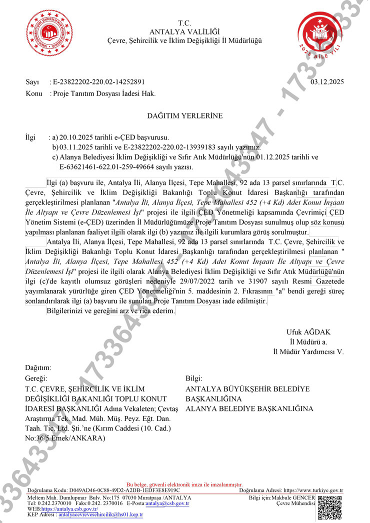 Yapılan açıklamada Alanya Belediyesi İklim Değişikliği ve Sıfır Atık Müdürlüğü’nün, ÇED Raporu’nda belli noktalara itiraz ederek olumsuz beyan verdiği için proje dosyasının iade edildiği bildirildi.