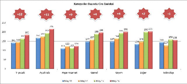 Mayıs ayında kategoriler bazında en yüksek artışın yiyecek kategorisinde gerçekleştiği görüldü. 2015 Mayıs ile kıyaslandığında 2016 Mayıs döneminde kategoriler bazında endeks yüzde 4’lük bir artış gösterdi. En yüksek ciro artışı yüzde 12 ile yiyecek kategorisinde görülürken ayakkabı-çanta kategorisi yüzde 11, hipermarket kategorisi yüzde 9, giyim kategorisi yüzde 4, AVM’lerdeki diğer alan ciroları yüzde 2,2 artış kaydetti.