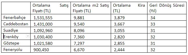 Ortalama değerlerle Suadiye’de konut metrekare satış fiyatı 8.096 TL, konut fiyatı 1.092.960 TL, kira 3.055 TL, konut yatırımının geri dönüş süresi 31 yıl. Konut satış fiyatının 1.030.400 TL, konut metrekare satış fiyatının 7.360 TL olduğu Erenköy’de ortalama kira 2.820 TL, konut yatırımının geri dönüş süresi 32 yıl. Göztepe’de ise ortalama konut metrekare satış fiyatı 7.297 TL, ortalama konut fiyatı 1.021.580 TL, ortalama kira 2.855 TL ve konut yatırımının geri dönüş süresi 31 yıl.