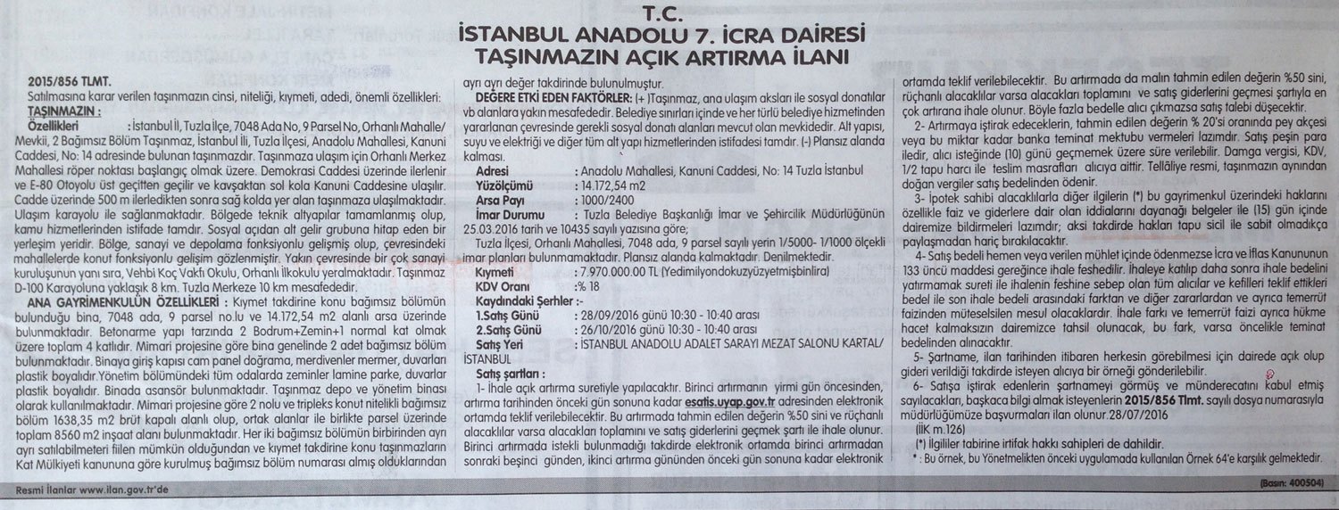 Tuzla Anadolu Mahallesi Kanuni Caddesi No 2 Orhanlı Mevkii’nde yer alan Bakırkcıoğlu Uluslararası Nakliyat’ın 14 bin 172 metrekare yüzölçümündeki arsası ile üzerinde yer alan toplam 8 bin 560 metrekare inşaat alanı olan taşınmaz icradan satışa çıkarıldı. Taşınmazın 6 bin 922 metrekaresi depo, 1638 metrekaresi de ofis olarak kullanılıyor.