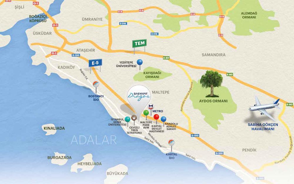 Maltepe’de yükselen proje minibüs caddesine 1 dakika, sahil yoluna 10 dakika, E5’e 5 dakika, Sabiha Gökçen Havaalanı’na 30 dakika mesafede bulunuyor. Yani proje Sabiha Gökçen’e yakın konut projeleri arasında diyebiliriz. Hastane ve Adliye metro duraklarına 5 dakika mesafedeki projeden Cevizli Tren İstasyonu 1 dakika uzaklıkta. Proje ayrıca deniz ulaşımına yakın konut projeleri arasında da bulunuyor. İdo Kartal Deniz Otobüsü ve Adalar-Bostancı İskelesi’ne 10 dakika mesafede yer alan proje, Maltepe Park’a 3 dakika, Anadolu Adliyesi 5 dakika, Yeditepe Üniversitesi’ne 20 dakika, İstanbul Şehir Üniversitesi’ne 5 dakika mesafede bulunuyor. Lokasyonu bakımında bu proje aynı zamanda öğrenciler için uygun konut projeleri arasında bulunuyor.