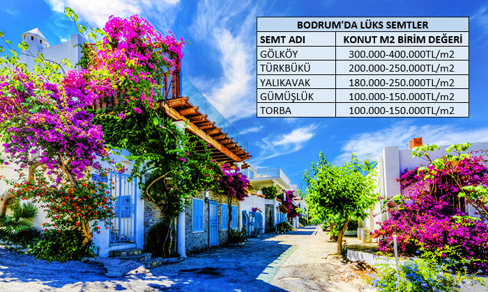 Bodrum’un en popüler lüks semtlerinden biri Türkbükü’dür. Bu bölge, kıpırtısız denizi, lüks otelleri, plaj kulüpleri ve gece hayatıyla ünlüdür. Ayrıca, Türkbükü’nün muhteşem plajları ve açık hava etkinlikleri de ziyaretçileri cezbetmektedir. Semtteki lüks villalar ve konutlar, Bodrum’un tadını çıkarmak isteyenler için harika bir seçenektir. Türkbükü Mahallesinde lüks konut m2 birim değerleri 200.000-250.000TL/m2 aralığında değişkenlik göstermektedir. Türkbükü Mahalesinde 2+1 ve 3+1 tipte dairelerin denize sıfır veya manzara yönünden fiyatları 25.000.000-35.000.000TL aralığında değişirken, bölge genelinde müstakil yapıda villaların fiyatları ise 80.000.000-120.000.000TL aralığında el değiştirmektedir.
