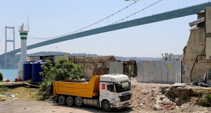 İstanbul Boğazı ön görünümünde kaçak oldukları gerekçesiyle İstanbul Büyükşehir Belediyesi tarafından yıkılan yapıların enkazı kaldırılmaya başlandı.