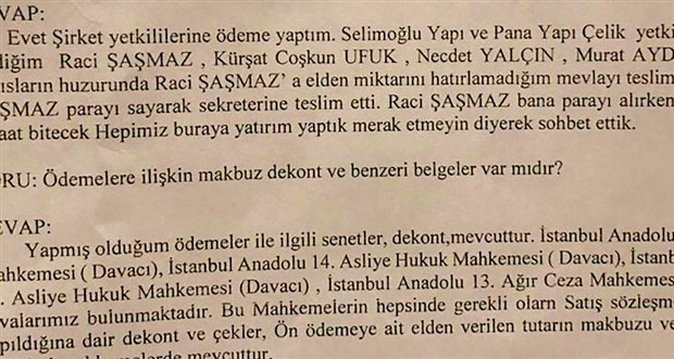 Mağdurlardan Ö.L.E. de iddiaları yalanladığı Emniyet ifadesinde şöyle diyor: Selimoğlu Yapı ve Pana Yapı Çelik yetkilisi olarak bildiğim Raci Şaşmaz’a, Kürşat Coşkun Ufuk, Necdet Yalçın, Murat Aydınlı isimli şahısların huzurunda elden miktarını hatırlamadığım meblağı teslim ettim. Şaşmaz’la parayı alırken, ‘Bir an önce inşaat bitecek, hepimiz buraya yatırım yaptık, merak etmeyin’ diyerek sohbet ettik. Bununla ilgili senet ve dekontlar mevcuttur.”