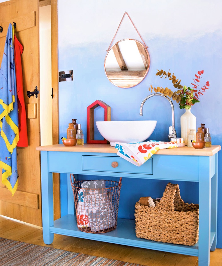 Elinizden geliyorsa banyo dolaplarınızı her yerde satılan eskitme boyalarıyla kobalt ya da turkuaz mavisine boyayabilir; banyonuza yepyeni bir duş perdesi alabilir ve kolaylıkla yenileyebilirsiniz.
