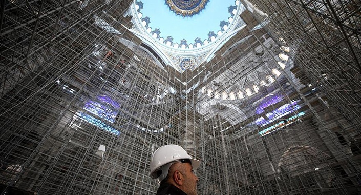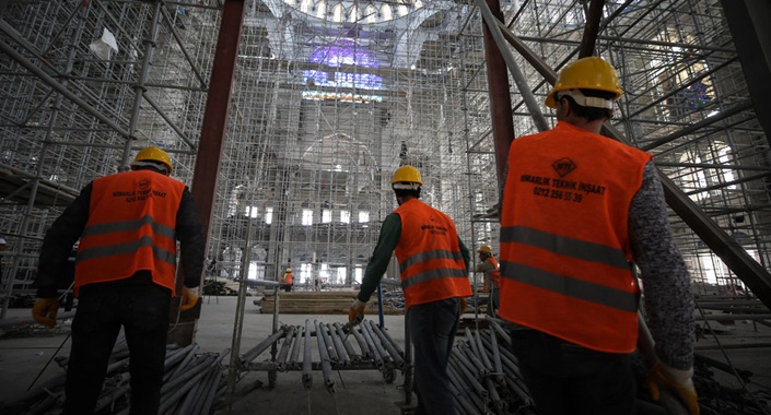 Atölyelerde mihrap, minber, müezzin mahfili vaaz kürsüsü, ahşap işi ve halı işlerinin devam ettiğini aktaran Külünk, “Yoğun bir çalışma yürütüyoruz. Asıl yoğunluk şu an camimizin içinde. 350 bin metreküplük bir iskele vardı. Bu iskeleyi sökmeye başladık. 2,5-3 ayda bu iskeleyi kurmuştuk. Şimdi iskeleyi 10-15 gün içinde sıfıra indireceğiz. İndirdikten sonra da yukarıda süsleme, tezyinat anlamında bir iş kalmıyor. Camide halının serilmesi ve yapılması gereken bir iki küçük iş kalıyor.” diye konuştu.