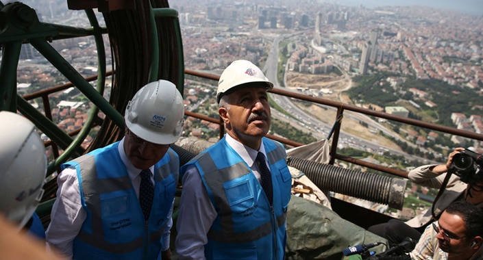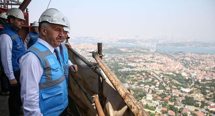 Ulaştırma, Denizcilik ve Haberleşme Bakanı Arslan, projenin teknik detaylarına ilişkin bilgi verirken, aşağıda inşa ve montaj edilen parçaların yukarıya çıkarıldığını söyledi.