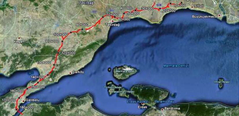 İki kesimden oluşan projenin ilk kesimi İstanbul Silivri, Tekirdağ Marmara Ereğlisi, Çorlu, Süleymanpaşa, Malkara ilçeleri, Çanakale Gelibolu, Lâpseki, Çan, Yenice İlçeleri, Balıkesir Balya ve Merkezi’nden geçerek 277 kilometre 599 metreye ulaşacak.