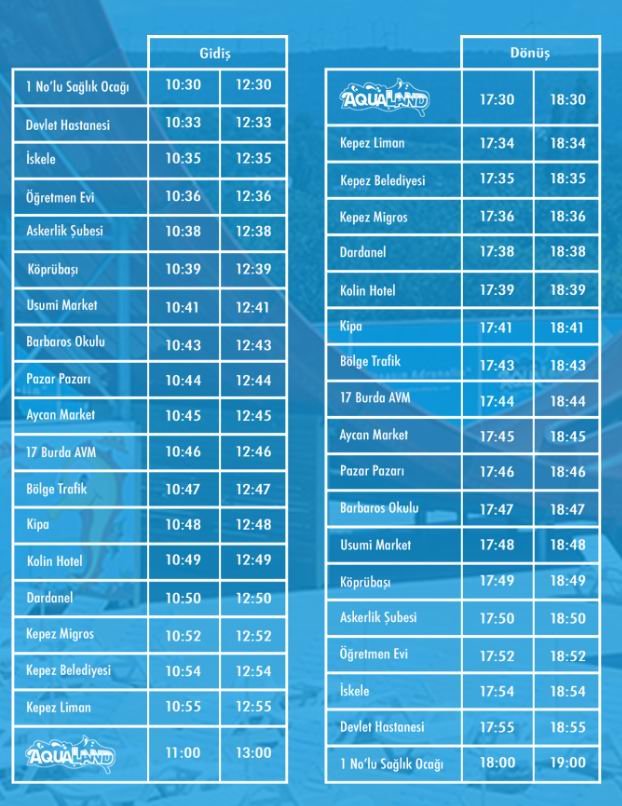 Çanakkale Aqualand şehir için servis güzergahı ve hareket saatleri şöyle;