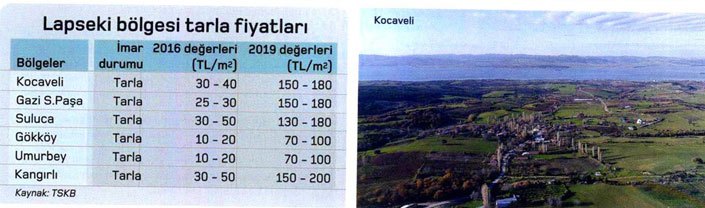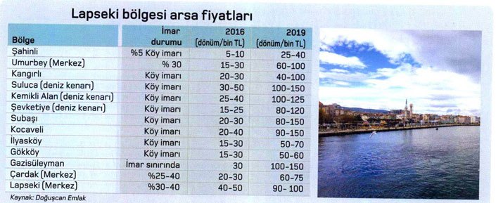 “2014’te en çok değerlenen Suluca’da deniz gören 4 dönüm bir araziyi 60 bin TL’ye ye almak mümkünken, 2016’da aynı arazinin fiyatı 150 bin TL’ye 2019’da ise 300-350 bin TL’ye ulaştı. Lapseki’de Dalyan bölgesinde 350 metrekare büyüklüğündeki imarlı arsaların fiyatı, 2016’da 90-100 bin TL civarında iken şu an 300-350 bin TL bandında seyrediyor” diyen Çırak, önümüzdeki dönemde Kocaveli, Gazi Süleyman ve Lapseki merkezinin en çok prim yapacak bölgeler olacağını öngörüyor.