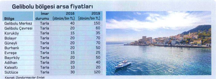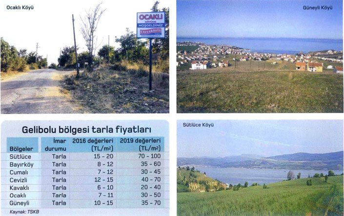 Gelibolu merkezine yakın bölgelerde, üç yıl önce dönümü 40 bin TL’den satılan tarlalar, aradan geçen bu üç yıl boyunca yaklaşık dört kat değerlenerek, bugün 150 bin TL gibi bir fiyatla satılıyor. Gelibolu’daki emlakçılar, arsa açısından en çok değerlenen bölgeler olarak Sütlüce, Bolayır’ın Marmara Denizi’ne bakan kısmı ve Güneyli Köyü’nü işaret ediyorlar, örneğin, Sütlüce’de üç yıl önce dönümü 30 bin TL olan tarlaların dönümüne bugün 120 bin TL düzeyinde bir fiyat isteniyor. Sütlüce gibi bölgede en çok talep gören köylerden biri de Bolayır. Zira Bolayır hem Çanakkale merkeze yakın hem de en gelişmiş noktalardan birisi. Bolayır’da 2016’da dönümüne 20 bin TL fiyat biçilen köydeki tarlaların bugünkü metrekare fiyatı 70 bin TL seviyesine ulaşmış durumda.