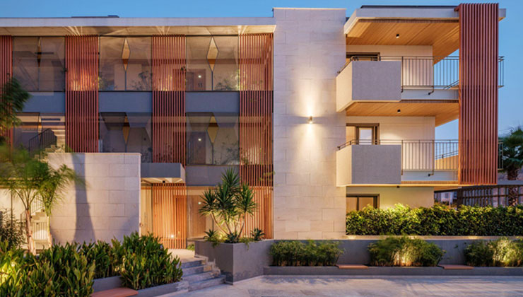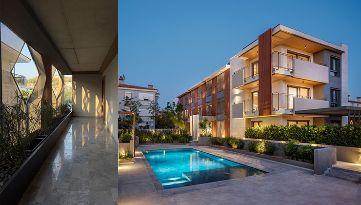 Geleneksel İzmir apartmanlarından ilhamla tasarlanan balkon detaylarında, alüminyum profiller, doğal taş kaplamalar ve brüt beton yüzeyler göze çarpıyor. Daire içi çözümler, gün ışığını ve manzarayı maksimize etmeye odaklı olarak planlanırken, dış cephede kullanılan malzemeler ise bölgenin iklim koşullarına uyum sağlıyor.