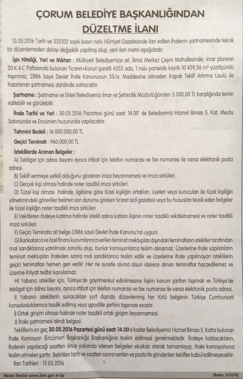 Çorum Belediyesi Çepni Mahallesi’ndeki 10 bin 459 metrekare yüzölçümündeki arsasını açık artırma ile satışa sundu. İmar planlarında ticaret ve konut alanı olarak işaretlenen parselin satışı 30 Mayıs 2016 tarihinde saat 14.00’te belediye binasında gerçekleştirilecek.