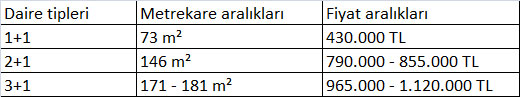 YDK Yapı’nın Ümraniye’de hayata geçirdiği Cuento İstanbul’da büyüklükleri 73 metrekarelik 1+1 daireler 430 bin TL’ye satılırken 146 metrekarelik 2+1 dairelerin fiyatları 790 bin TL ile 855 bin TL arasında değişiyor. Projedeki 171 – 181 metrekarelik 4+1 dairelerin fiyatları ise 965 bin TL’den başlıyor, 1 milyon 120 bin TL’ye kadar çıkıyor.