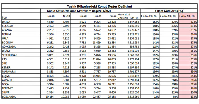 Yazlık konut fiyatı artışında öne çıkan 9 ilçenin pandemi dönemi konut satışlarındaki değer değişimi şaşırttı. Son üç yılda konut satış değerinde en çok artış %432 ile Datça’da gerçekleşirken, Datça’yı %394 ile Kuşadası, %392 ile Alanya ve %376 ile Fethiye ve %375 ile Urla takip etti.