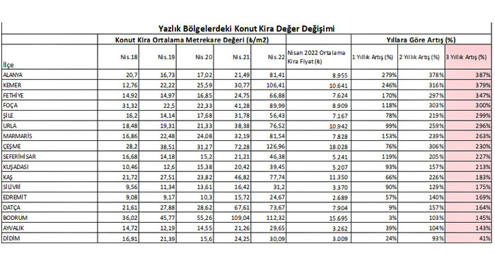 Kira artış değeri olarak incelendiğinde son 3 yılda yüzde 387 artışla rekor Alanya’nın oldu. Alanya’yı yüzde 379 ile Kemer, yüzde 347 ile Fethiye, yüzde 300 ile Foça, yüzde 299 ile Şile ve yüzde 296 ile Urla takip etti.