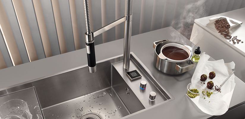 AYT Home’un satışa sunduğu Dornbracht’ın ilk elektronik ürünü eUnit Kitchen, çeşitli fonksiyonları ile mutfaktaki günlük işleri büyük ölçüde kolaylaştırıyor. Su sıcaklığı ve miktarının kumanda elemanları üzerinden hassas bir şekilde kontrol edilmesini sağlayan bu armatür, yanında ayak sensörü ile üçüncü bir elin yerine geçerek dokunmadan su çıkışı sağlıyor.