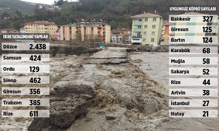 Taşkın riski altında bulunan yapıların dağılımı da korkunç tabloyu gün yüzüne çıkardı. Buna göre sadece 7 kentte 4805 yapı dere yatağına inşa edildi. Risk altında olan kentlerin ilk sırasında 2438 yapıyla Düzce yer aldı. Düzce’yi sırasıyla Samsun, Sinop, Ordu, Giresun, Trabzon ve Rize izledi.
