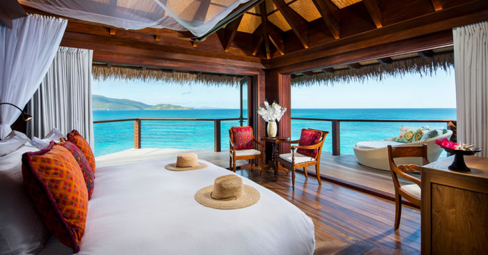 Branson’un 10 yatak odalı Bali tarzı villası plaja bakıyor ve her yatak odası camekanları sayesinde manzarayı izlemeye olanak sağlıyor.